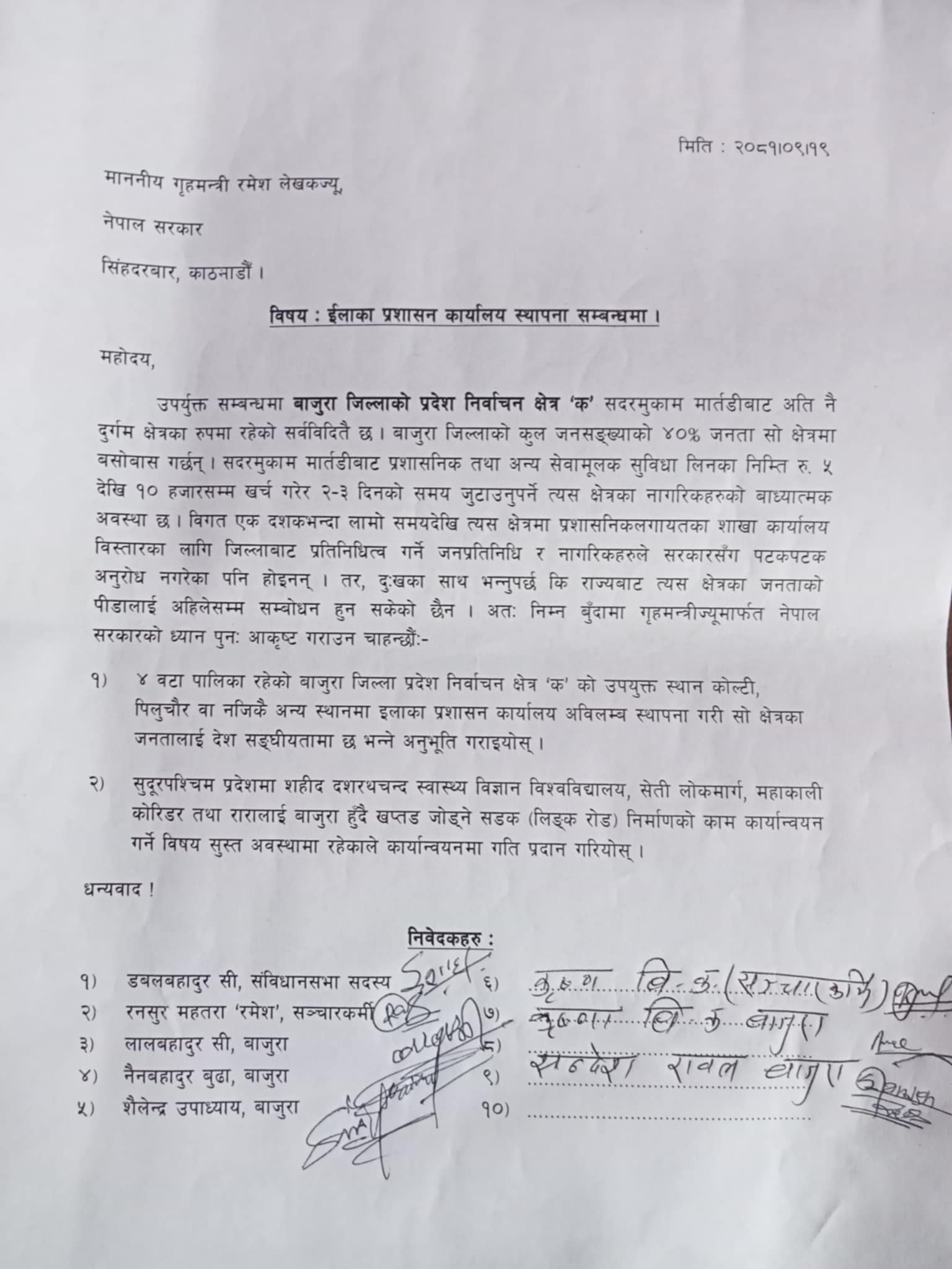 यस्ताे छ गृहमन्त्री रमेश लेखकलाई बुझाइएको ज्ञापनपत्र