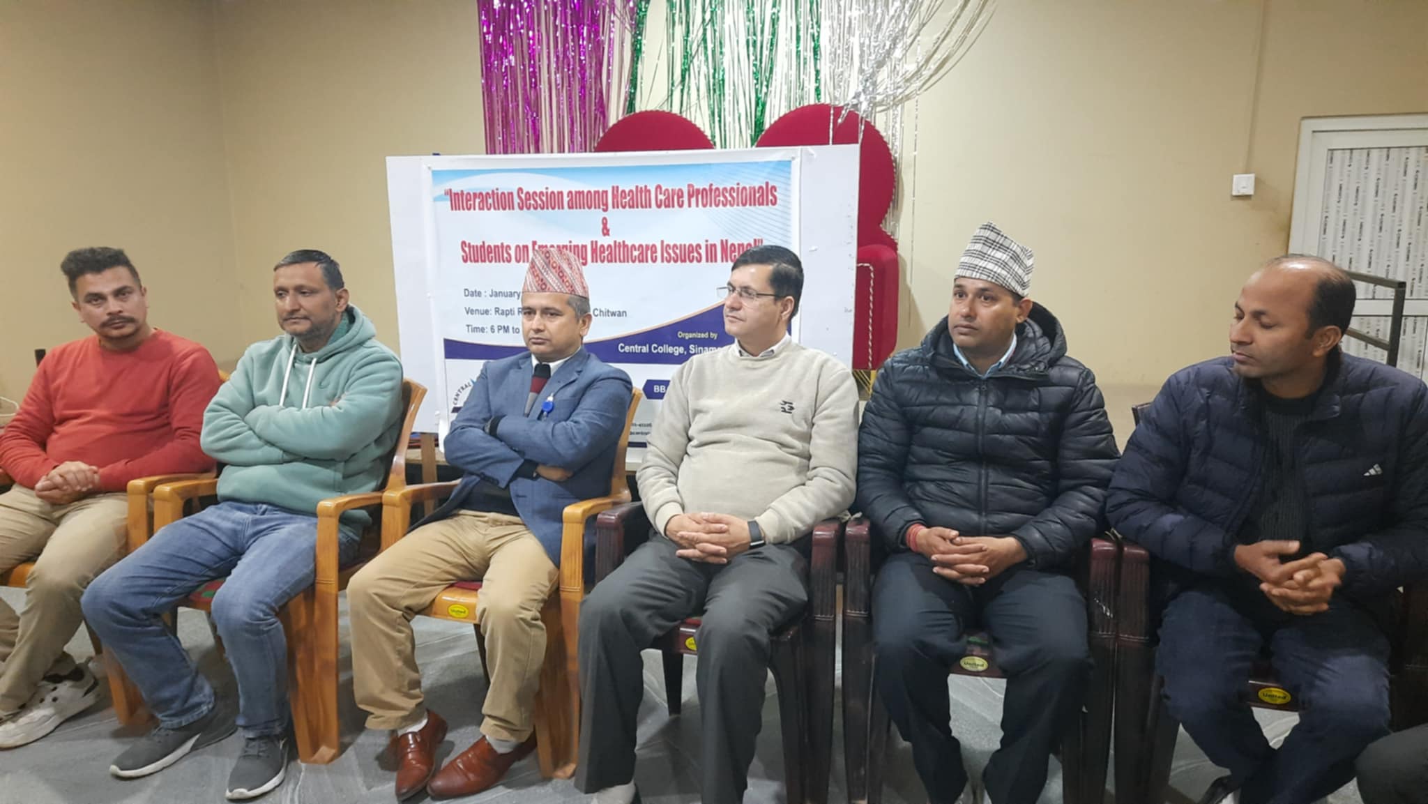 चितवन ।सेन्ट्रल कलेज काठमाडौंको आयोजनामा नेपालमा हेल्थ केयर प्रोफेसनल र विद्यार्थीहरुको उदाउँदो स्वास्थ्यसेवाको भविष्य विषयक अन्तरक्रिया (Interaction Session among Health Care Professionals and Students on Emerging Healthcare Issues in Nepal) विषयक एक अन्तरक्रिया कार्यक्रम सौराहाको राप्ती रिसोर्टमा सम्पन्न भएको छ।