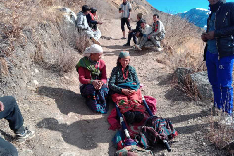 ठेहे गाउँबाट सदरमुकाममा रहेको जिल्ला अस्पतालमा पैदलबाट तीन घण्टा लाग्छ। गाडीबाट एक घण्टा लाग्ने भएपनि केही दिनअघिको हिमपातले सिमकोट गाउँपालिका–३ को मन्की खोलामा बरफ जमेका कारण गाडी जान नसक्ने भएपछि स्टेचरमा बोकेर ल्याइएको थियो।