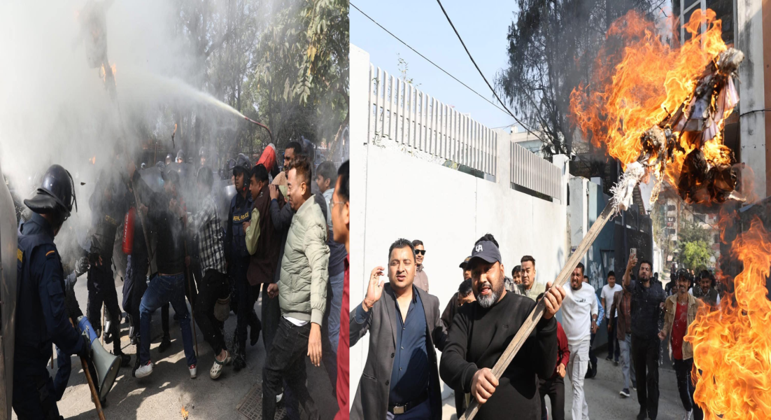 विद्यार्थीले विश्वभाषा क्याम्पसबाट खड्काको पुतला जलाउँदै प्रदर्शन गरेका थिए । प्रहरीले हस्तक्षेप गरेर आगो निभाएको छ।