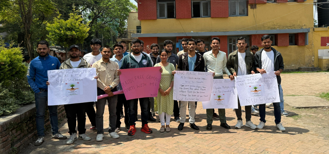 काठमाडौं। विश्व वातावरण दिवस २०२५ को अवसरमा, त्रि–चन्द्र बहुमुखी क्याम्पसमा नेपाल विद्यार्थी संघ (नेविसंघ) इकाईले प्लास्टिक प्रदूषण अन्त्य गरौं भन्ने नारासहित विशेष सचेतना कार्यक्रम आयोजना गरेको छ। कार्यक्रमले प्लास्टिकजन्य सामग्रीको प्रयोगविरुद्ध आवाज उठाउँदै क्याम्पस परिसरमा सरसफाइ, प्लेकार्ड प्रदर्शन, र विद्यार्थी संवादजस्ता विविध गतिविधिहरू सम्पन्न गर्यो।