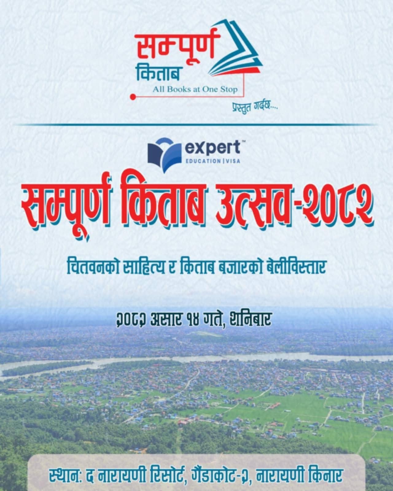 चितवन। नारायणगढको सम्पूर्ण किताबले सम्पूर्ण किताब उत्सव -२०८२ गर्ने एक कार्यक्रमको बीच जानकारी गराएको छ। चितवनको साहित्य र किताब बजारको बृहत जानकारी प्रस्तुति एवम् ट्रेलर सार्वजनिक गर्ने उद्देश्यले उत्सव आयोजना गरिएको अक्षर समूहका अध्यक्ष तथा कार्यक्रमका निर्देशक लेखराम सापकोटाले बताए। उत्सवको पहिलो संस्करण दिउँसो १२ बजेदेखि बेलुका ७ बजेसम्म शनिवार गैंडाकोटस्थित द नारायणी रिसोर्टमा हुनेछ। शैक्षिक परामर्शदाता संस्था एक्सपर्ट एजुकेशन चितवनको शिर्ष प्रायोजन किताब उत्सव आयोजना गरिएको कार्यक्रमका सह निर्देशक विनोदबाबु रिजालले जानकारी दिए।