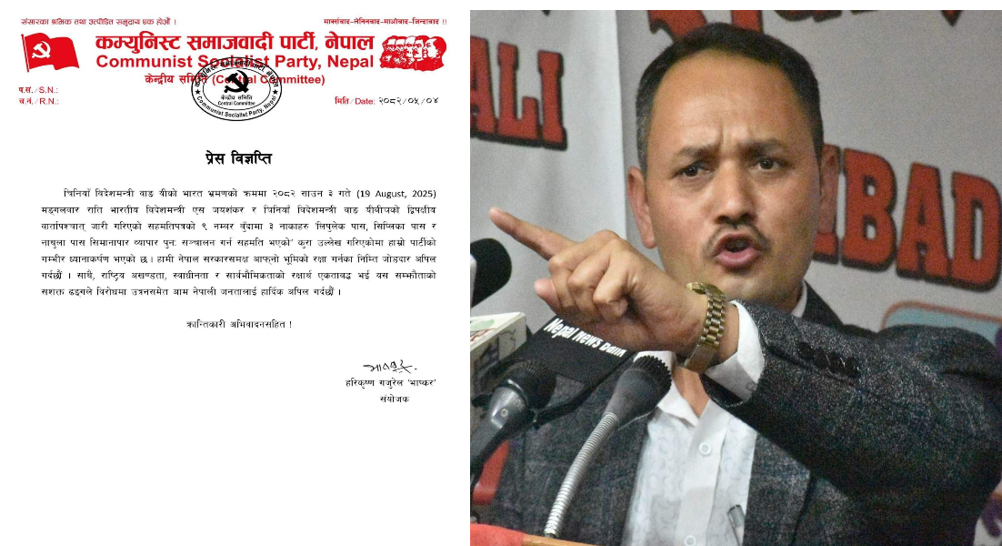 काठमाडौं। भारत र चीनबीच लिपुलेकसहित तीन नाकाबाट सिमाना पार व्यापार पुनः सञ्चालन गर्ने भर्खरैको सहमतिले नेपालको राष्ट्रिय स्वाधीनता र क्षेत्रीय अखण्डतामाथि प्रश्न खडा गरेको छ। कम्युनिस्ट समाजवादी पार्टी, नेपालले यस सम्झौताप्रति कडा आपत्ति जनाउँदै नेपाल सरकारलाई आफ्नो भूमिको संरक्षणका लागि तत्काल कदम चाल्न आग्रह गरेको छ।