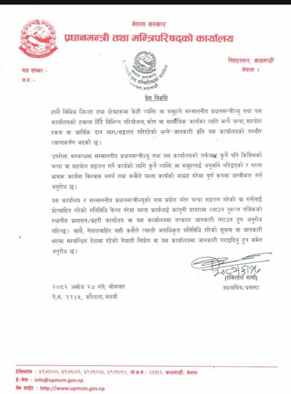 प्रधानमन्त्री तथा मन्त्रिपरिषद्को कार्यालयका प्रवक्ता रविलाल शर्माद्वारा जारी विज्ञप्तिमा भनिएको छ, ‘प्रधानमन्त्रीज्यू वा यस कार्यालयको तर्फबाट कुनै पनि व्यक्ति वा समूहलाई चन्दा वा सहयोग सङ्कलनका लागि अनुमति दिइएको छैन । यस्ता भ्रामक गतिविधिमा विश्वास नगर्न र कसैले यस्तो आग्रह गरेमा पूर्ण रूपमा अस्वीकार गर्न अनुरोध छ।