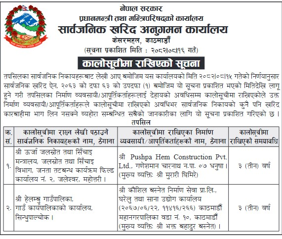 काठमाडौं । सार्वजनिक खरिद अनुगमन कार्यालयले काम समयमै पूरा नगर्ने दुईवटा निर्माण कम्पनीलाई कालो सूचीमा राखेको छ ।