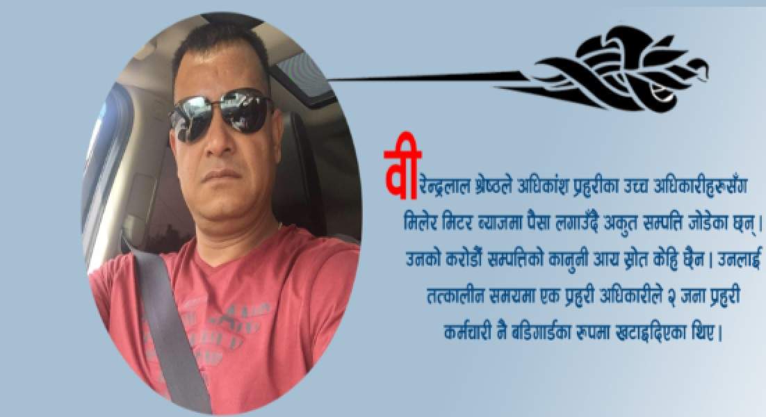 राजधानीका मिटर ब्याजका किङ मानिने विवादास्पद छवि भएका बिरेन्द्रलाल श्रेष्ठलाई प्रहरी अधिकारीले नै किन संरक्षण गरिरहेका छन्। चर्को ब्याजमा रकम उपलब्ध गराउने विरेन्द्रलालको उद्देश्य नै ऋणीको घरजग्गा हड्प्ने बाहेक अरु नहुने रहेको छ।