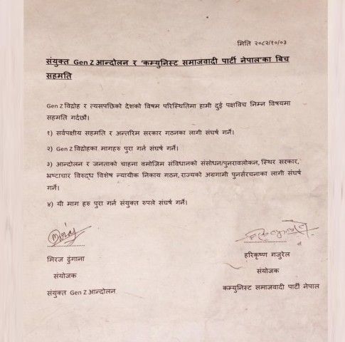सहमति पत्रमा संयुक्त जेनजी आन्दोलनका तर्फबाट संयोजक मिराज ढुंगाना र कम्युनिस्ट समाजवादी पार्टी नेपालका तर्फबाट संयोजक हरिकृष्ण गजुरेलले हस्ताक्षर गरेका छन्। दुवै जनाले सहमतिलाई वर्तमान परिस्थिति बीचको महत्वपूर्ण एकताको सुरुआत भएको बताएका छन्।