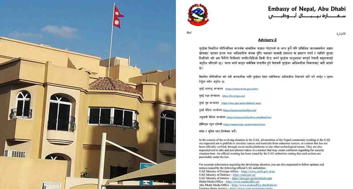 पछिल्लो २४ घण्टामा दोस्रो एडभाइजरी जारी गर्दै दूतावासले यस्तो आग्रह गरेको हो । यूएईमा विकशित परिस्थितिका सन्दर्भमा सामाजिक सञ्जालमा कुनै अज्ञात स्रोतबाट आएका सामग्री पोस्ट नगर्न अनुरोध गरेको हो।