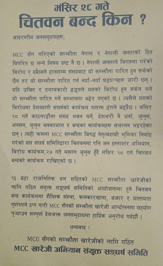 राष्ट्रघाती एमसीसी सम्झौता खारेजीको विरोधमा चितवन बन्दको घोषणा