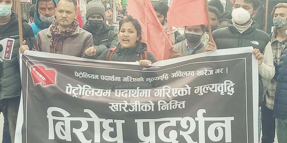 पेट्रोलियम पदार्थको मूल्यवृद्धि फिर्ता लिन अखिल (क्रान्तिकारी)द्वारा माइतीघर मण्डलामा विरोध प्रदर्शन