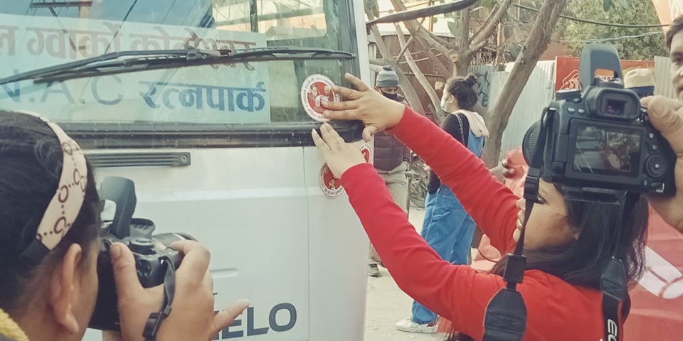 प्रहरी हस्तक्षेपका बाबजुद सार्वजनिक यातायातमा अखिल (क्रान्तिकारी)ले नो एमसीसी लेखेका स्टिकर टास्यो (फोटोफिचर)