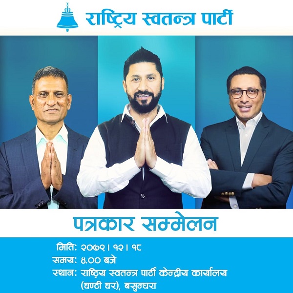 काठमाडौं । राष्ट्रिय स्वतन्त्र पार्टीका अध्यक्ष रवि लामिछाने, सुशासन पार्टीका अध्यक्ष रमेश खरेल र हालै कांग्रेस छाडेका अर्थविद् डा.स्वर्णिम वाग्लेले आज (शनिबार) संयुक्त पत्रकार सम्मेलन गर्ने भएका छन्।