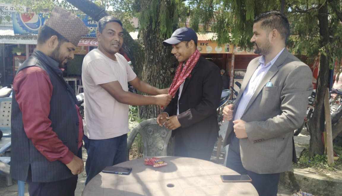 खुला आकाशमा स्वागत गर्दै संगठनको तर्फबाट अध्यक्ष शेरबहादुर विश्वकर्मा,सचिवालय सदस्यहरु रमेश महतारा,शोभराज बराल र साहस भट्टले खादा लगाएर अभिनन्दन गरेका थिए।