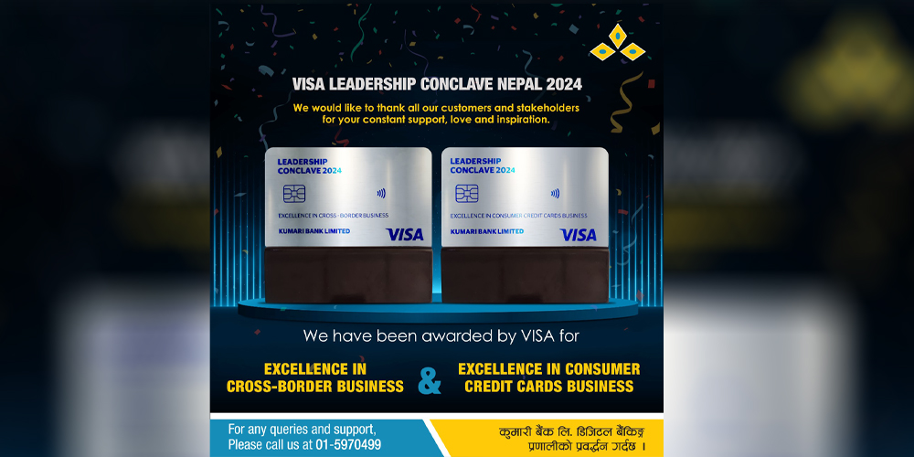 असोज ५ मा आयोजित उक्त कार्यक्रममा ‘एक्सिलेन्स इन कन्जुमर क्रेडिट कार्डस् बिजनेस’ र एक्सिलेन्स इन क्रस बोर्डर बिजनेस’ अवार्डबाट कुमारी बैंक सम्मानित भएको हो।